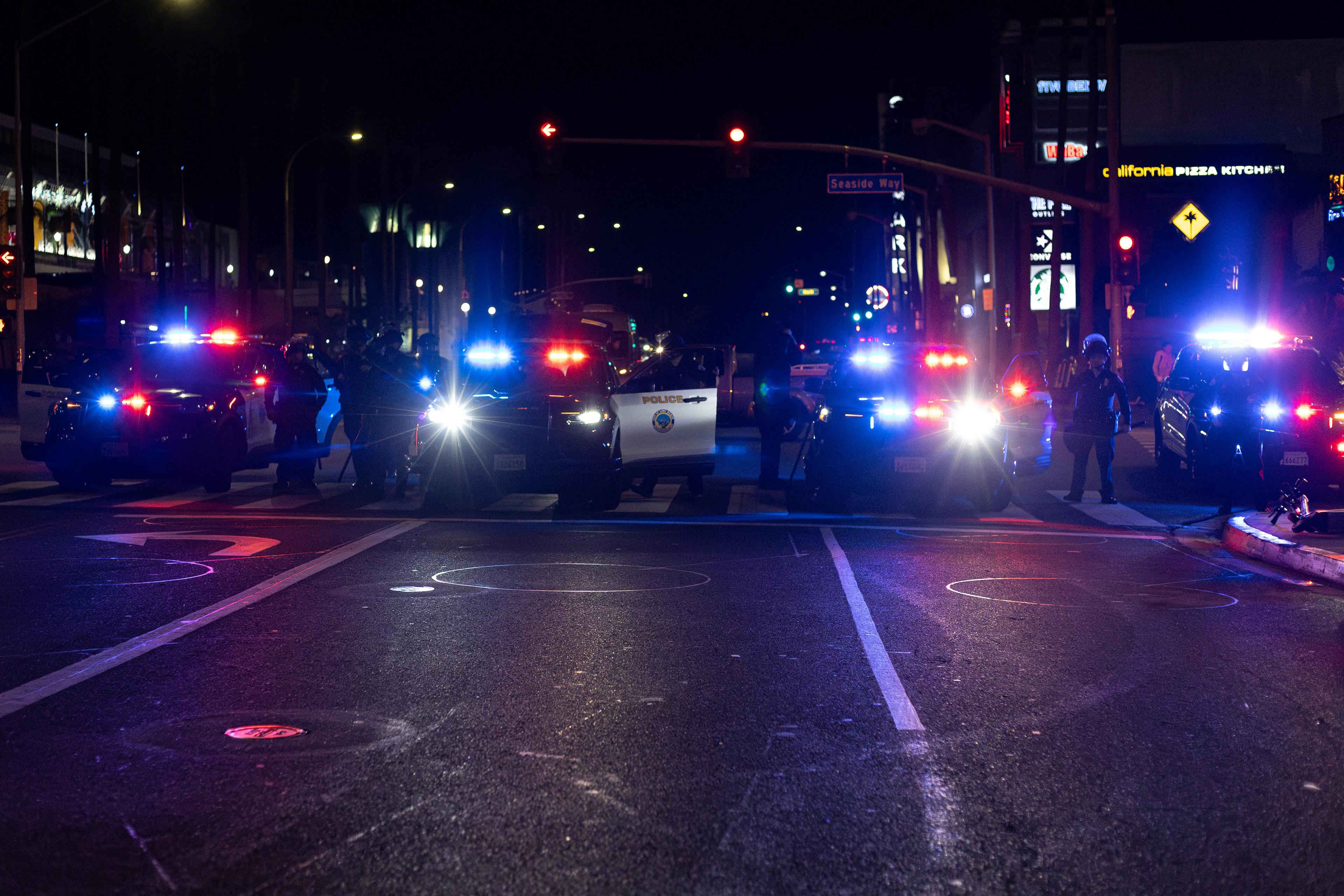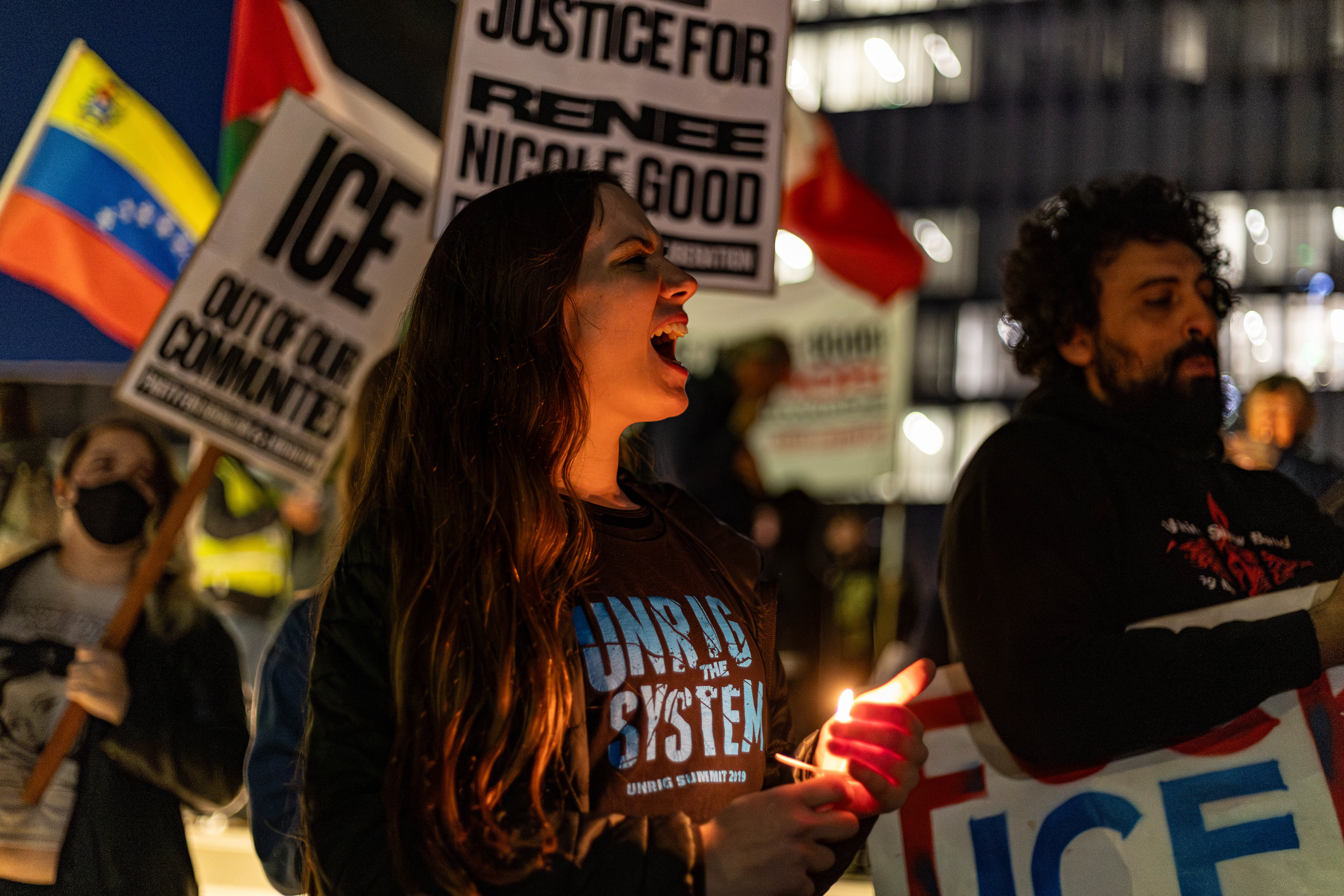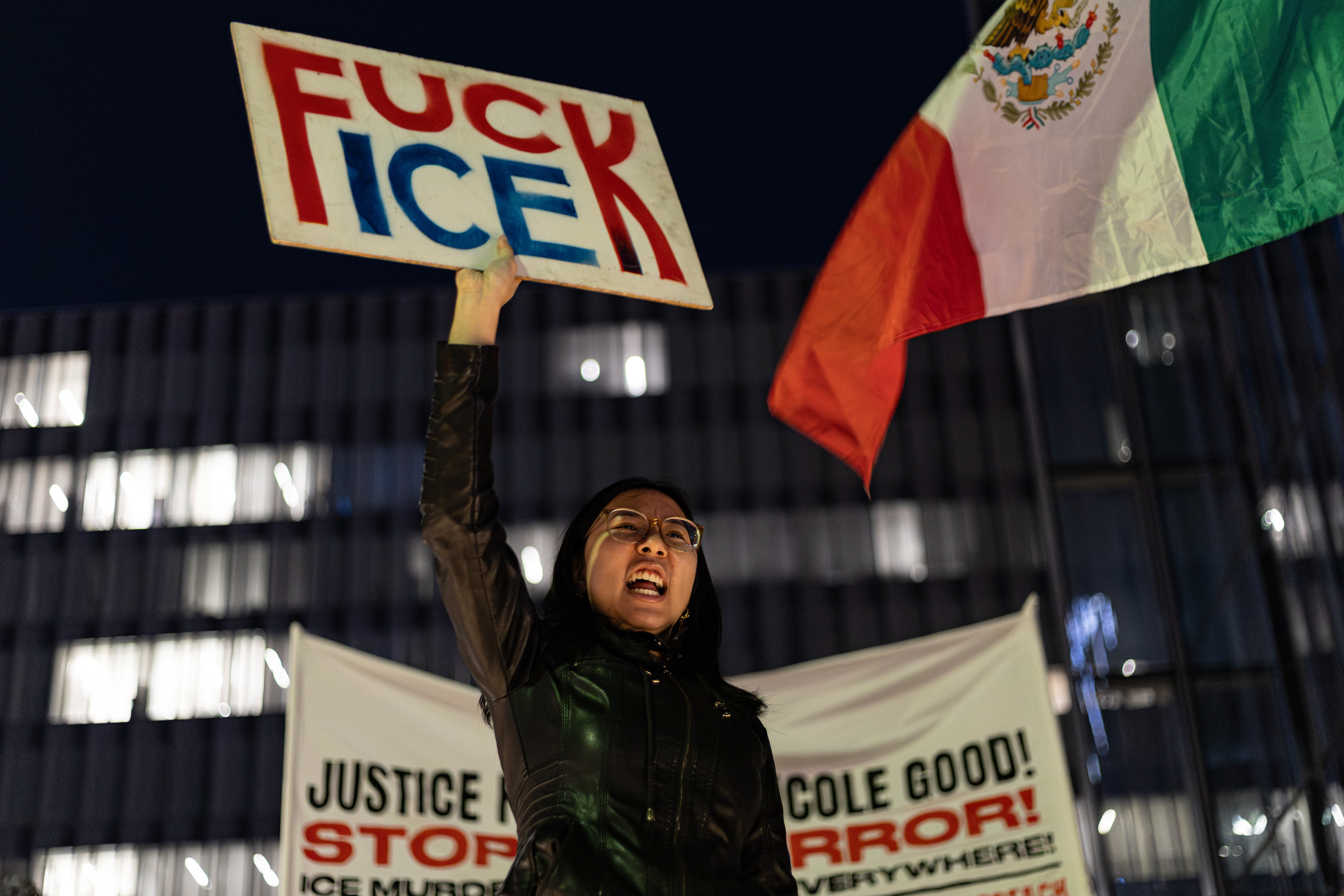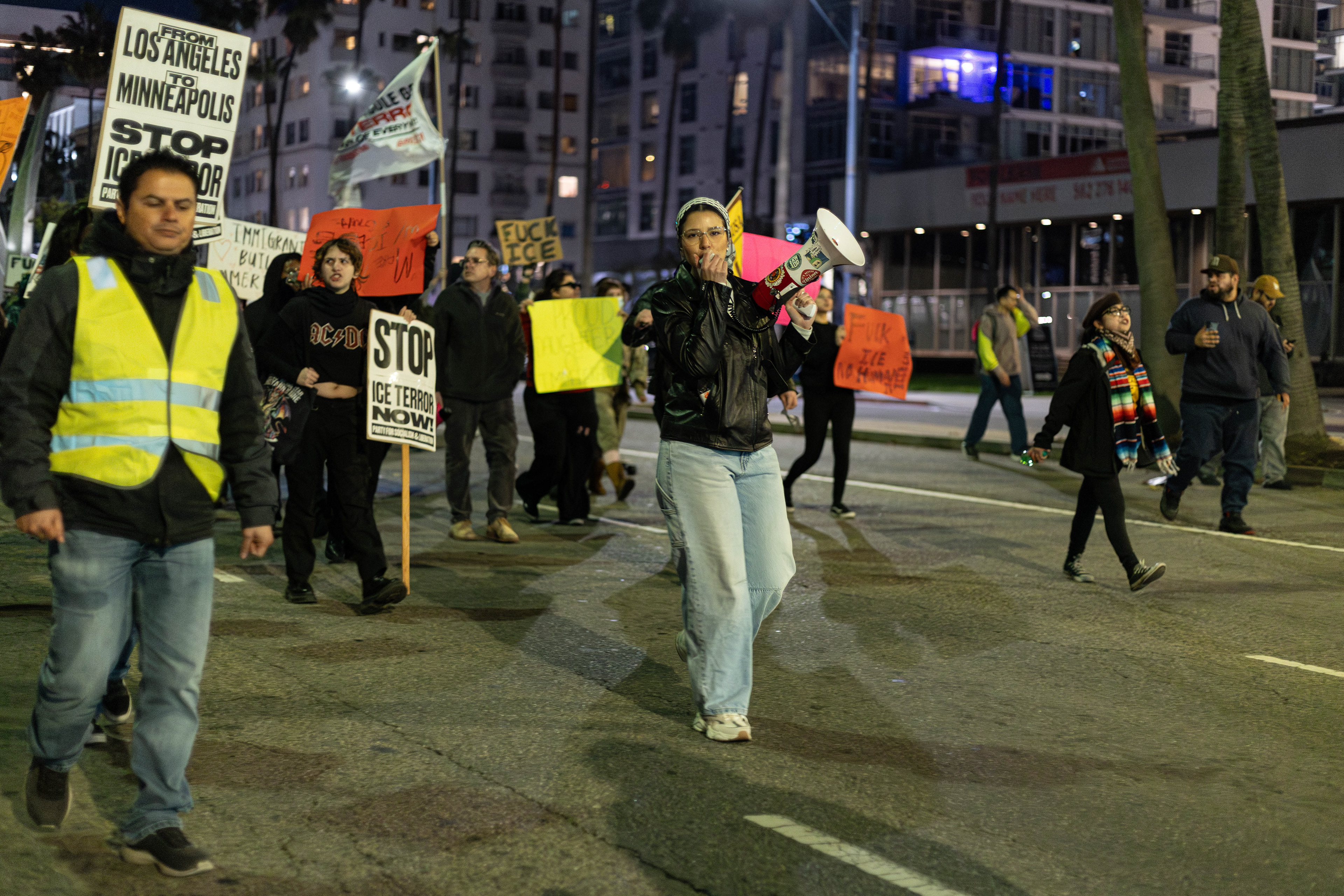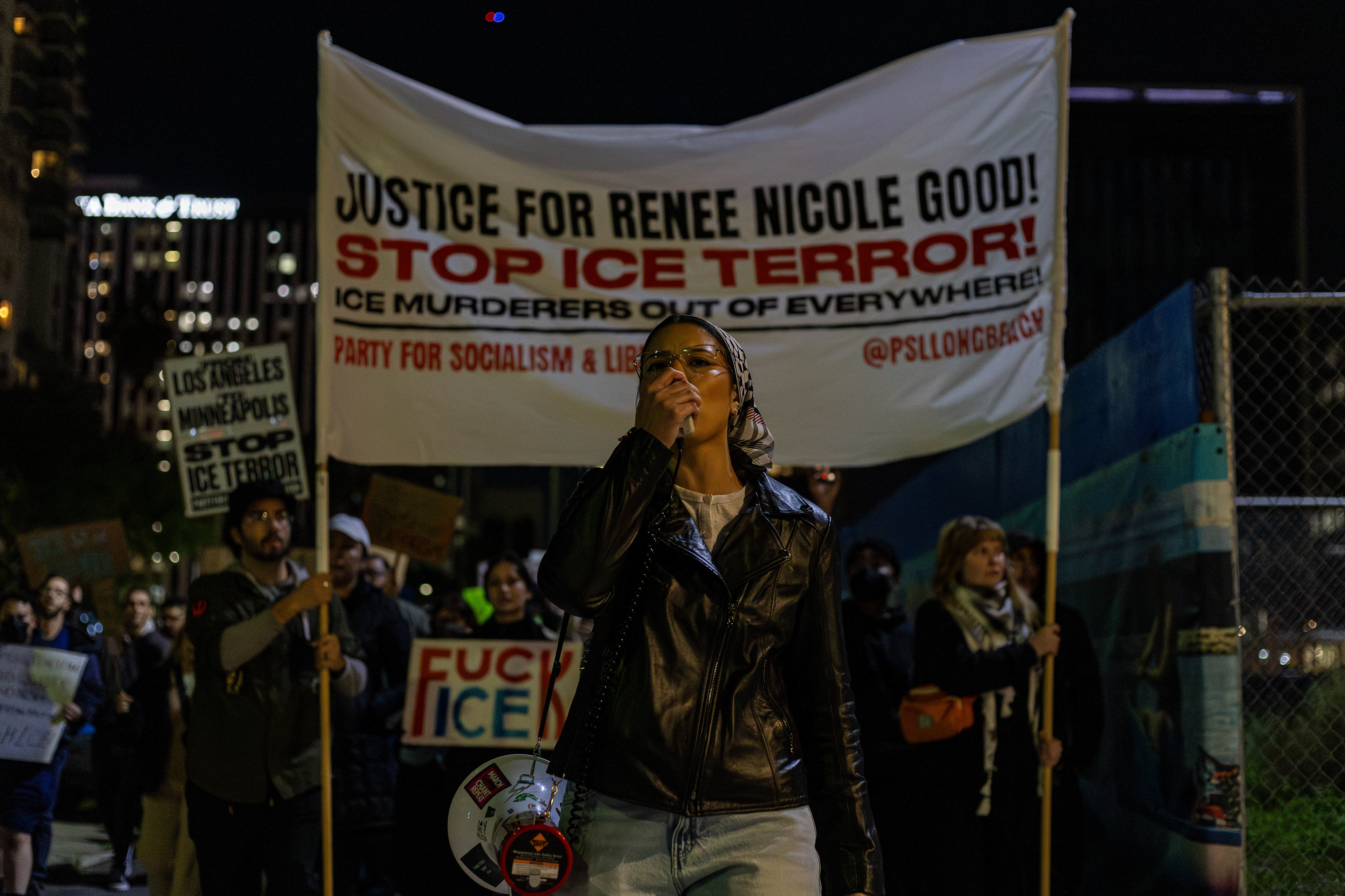 PSL (Party for Socialism and Liberation) Long Beach organized the protest late Thursday, Jan. 8, 2026. This was hours after a legal observer, Renee Nicole Good, was shot and killed by an Immigration Customs and Enforcement (ICE) agent in Minneapolis, Minnesota.